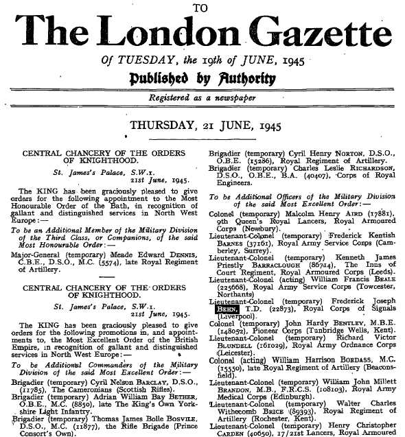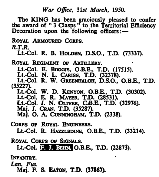 In 1950 he was awarded 3 Clasps to his Territorial Efficiency Decoration (5 more years service for each clasp)