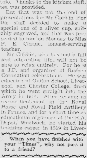 Born Liverpool 1893 Percy Cubbin played for the Aliens in the last few seasons before the Great War. He was educated at Oulton School and completed his teacher training like many of his team mates at Chester College.