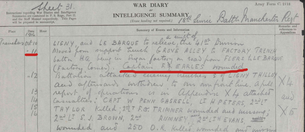 Charles was one of hundreds of 22nd Battalion men killed on the 1st July, but Francis survived the day. We don't know what he did between then and the 1st August. On that day he joined the 18th Battalion of the Manchester Regiment and served with them for the rest of his time in France.