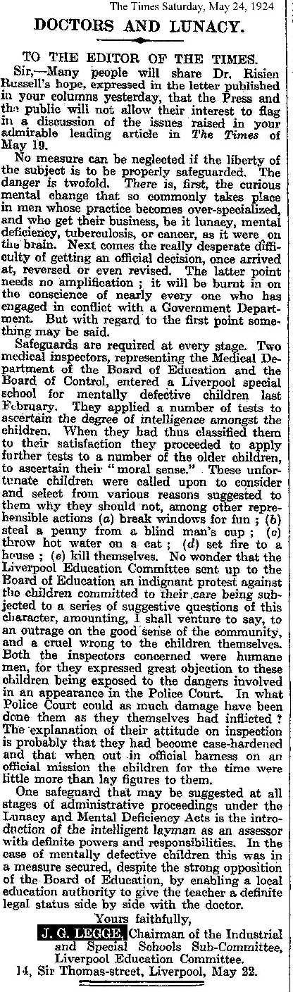 At the annual meeting of the Garston and District Nursing Association, Liverpool, which receives a grant towards the work of its school nurse, Mr. J.G. Legge, Director of Education, said that there was a suggestion that too much was being done for children by the authorities, and that parents were being relieved, thus causing a loss of grit and fibre, which was the pride of our race. An immense work was being done by that Association, and the real point was in the way it was done. If relief was merely shovelled out it would weaken the moral fibre, but where relief was given under proper conditions it would strengthen rather than weaken.