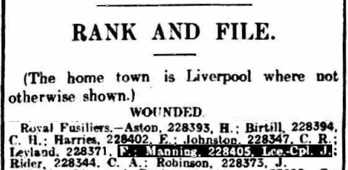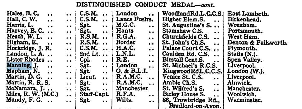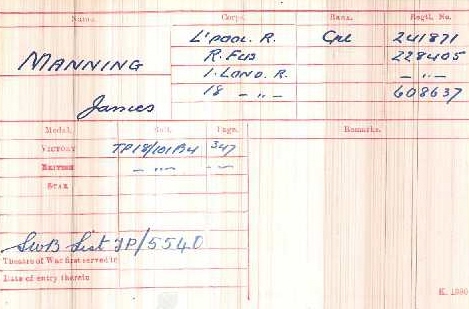 For WW1 James Manning joined up in the King's Liverpool Regiment, then on to the Royal Fusiliers and London Regiment. According to NUT Records he won the DCM. (Can't be ratified as the award went to a Scots Guard with the same name). He was invalided out of the war with a gun shot wound to the back and head, receiving the Silver War Badge.
