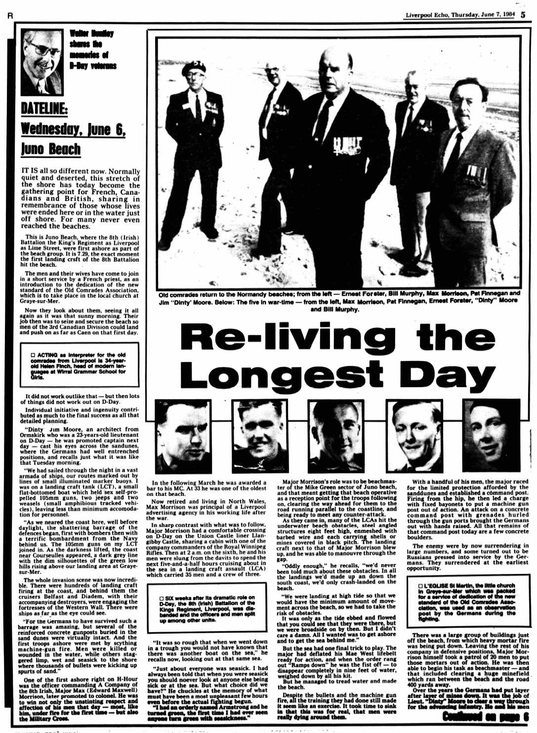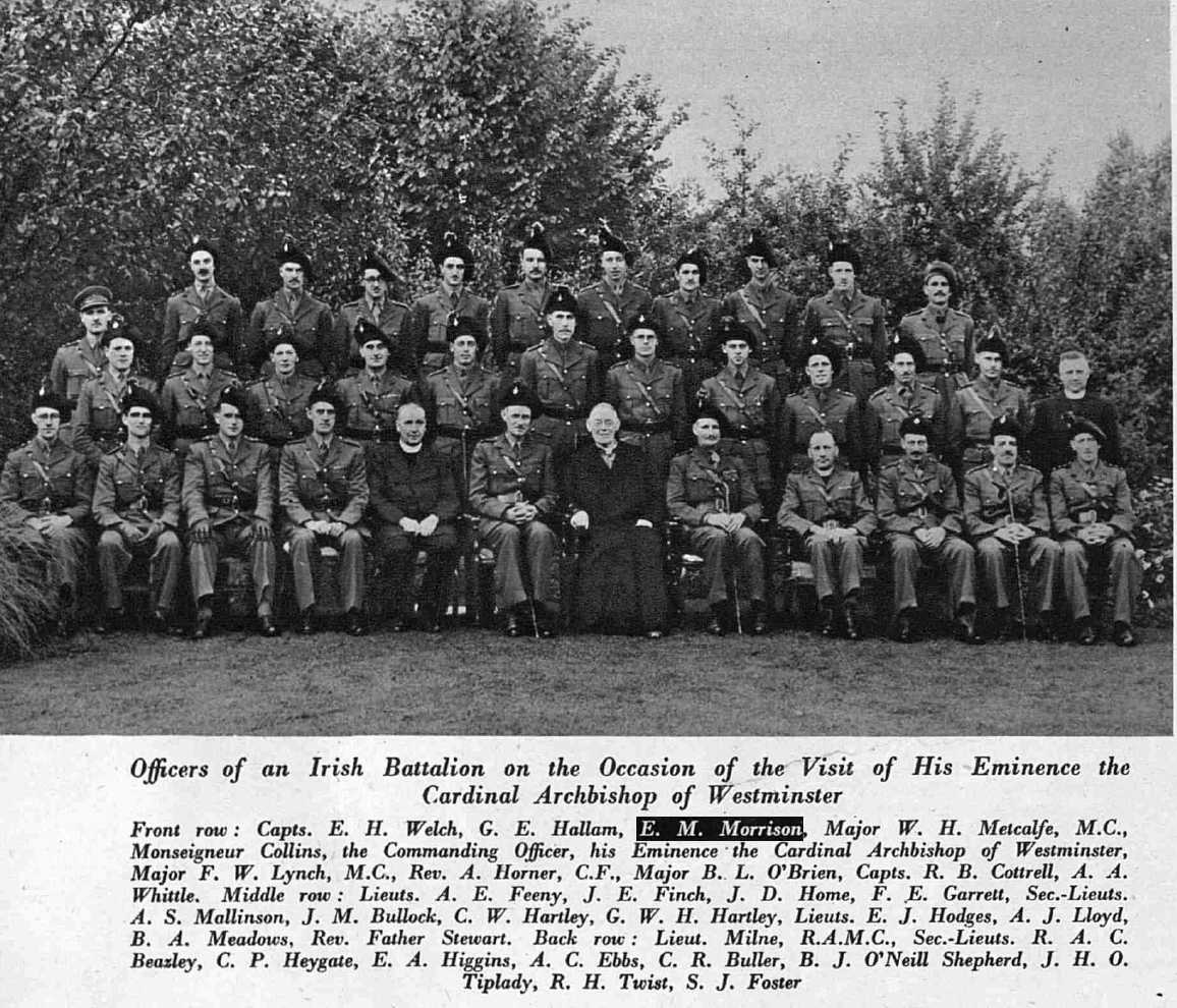 On the Western end of the beach A Company of the Liverpool Irish landed with the leading company of the Royal Winnipegs. Major E.M. Morrison, the A Company [Commander] was the first out of the landing craft: heavily laden, he jumped unwittingly into nine feet of water but managed to stagger ashore. Others disembarking from the same landing craft, including the second in command of the Royal Winnipegs company were killed struggling to the shore. With a mere handful of his troops Major Morrison reached the limited protection of the sand-dunes and established a command post for the "Mike Green" beach area.