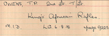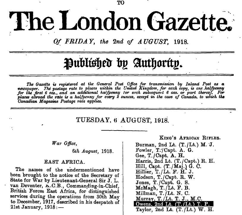 When the Great War broke out TPO undertook officer training and was commissioned 2nd Lt in "The Buffs", the East Kent Regt in August 1915. His military career developed in late 1916 when he was attached to the King's African Rifles as part of 'Norforce', the Nyasaland & North-East Rhodesia Field Force under the command of Major-General Edward Northey. Their task was to push back the German forces, the Schutztruppe out of the region.