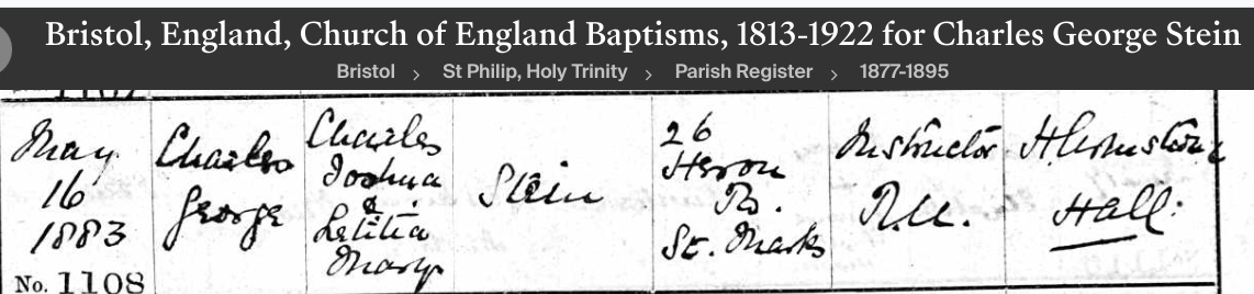 Mary Stein. He was baptised on the 16th May 1883 at St Philip, Holy