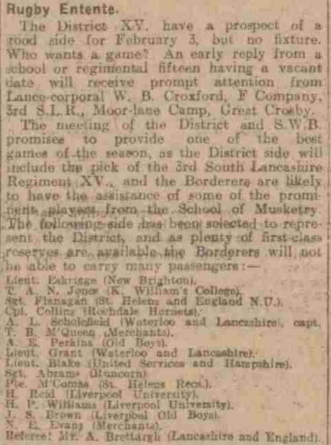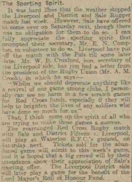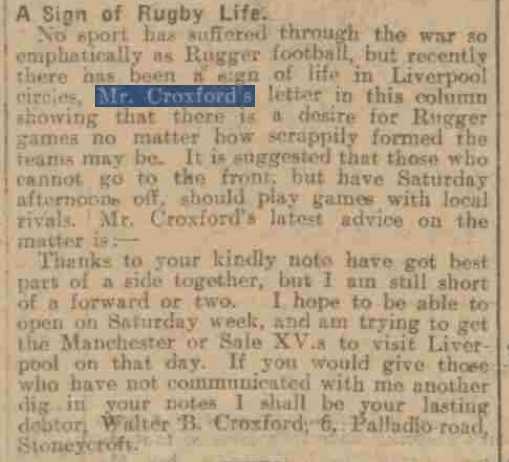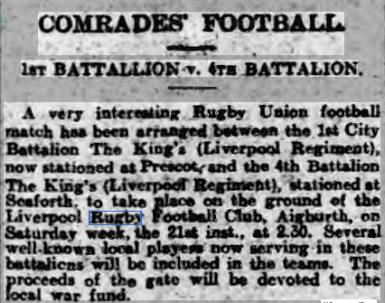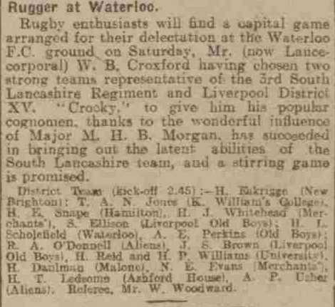Croxford keeps the game of Rugby alive on Merseyside during the Great War