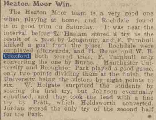 By 1904 he had moved to Manchester and with the demise of the Manchester Athletic Club rugby team in Fallowfield he started to play for the up and coming club Heaton Moor.