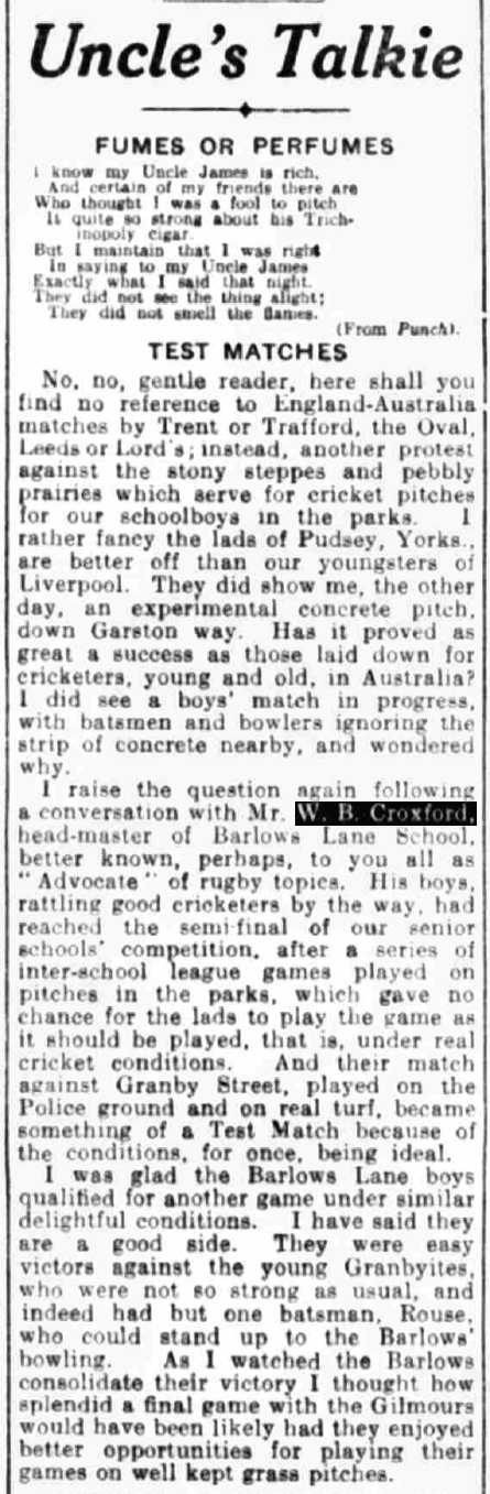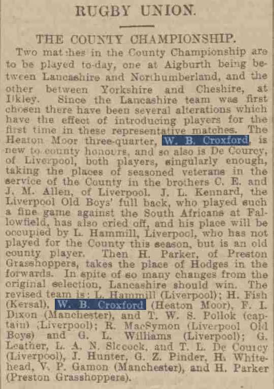 Harry Fry, a former England international and Past President of Lancashire rugby writes: W.B. Croxford was one of the great men of Lancashire rugby. Educated and trained in the game at Denstone, he played for Lancashire as a wing three-quarter before the First World War.