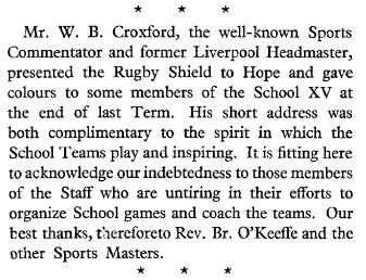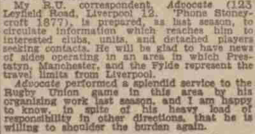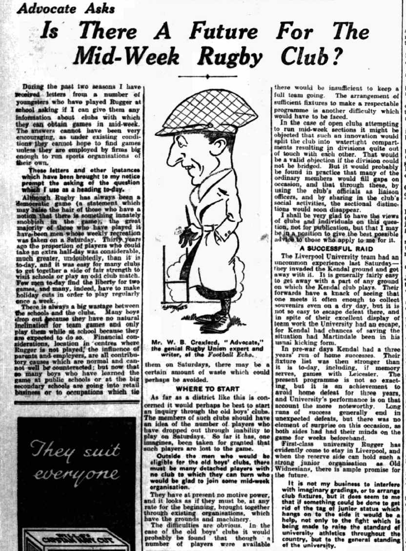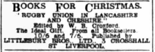 The Aliens- surely it is time a more appropriate name was found for this club, put up a good fight with fourteen men at Heaton Moor, in a match in which W.B.Croxford played at stand-off half- back, and scored his side's only try. As a member of the Lancashire County Committee, and also of the Selection Committee and the Schools' Sub-Committee, Mr. Croxford has done valuable service for the football of the county in the last twelve months of reconstruction. At a time when a keen organiser was needed to revive the game in Liverpool, Mr. Croxford worked with tremendous earnestness and the fact that Merseyside Rugger revived so splendidly is due in a large measure to his untiring efforts. One thought his playing days were over, but, having done everything that was possible for one man to do as an organiser and in the committee-room, he apparently needed an outlet for still more energy. Mr. Croxford and Mr. Edgar Craig, of Broughton Park, have made a great effort to do for Lancashire what Mr. R. F. Oakes has done for Yorkshire. (1920)