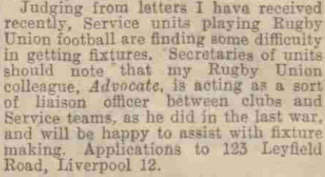 One of the best achievements in Merseyside Rugger last week-end was the victory of Sefton on the new ground of the Old Salfordians, for the Salfordians have built up a great reputation for home victories during the past two seasons. Though they were without the assistance of S. Brown, who was playing for his own club, St. Helen’s Old Boys, Sefton were able to include in their pack Laker, formerly of Sunderland and the Old Whitgiftians, and the forwards played a capital game against their heavier opponents, while the backs utilised their opportunities very smartly, Norman Hutchings being in especially good form.
