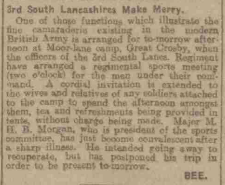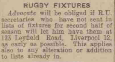 There has been some little misapprehension as to the reference to the Sefton club’s ground at West Derby as "primitive." The playing piece is well enough, and big enough, but it is a field among fields with no appointments save the goal posts and touch flags. The allusion to primitive conditions was made with the idea of showing how admirable the sporting spirit of the members is in face of difficulties.