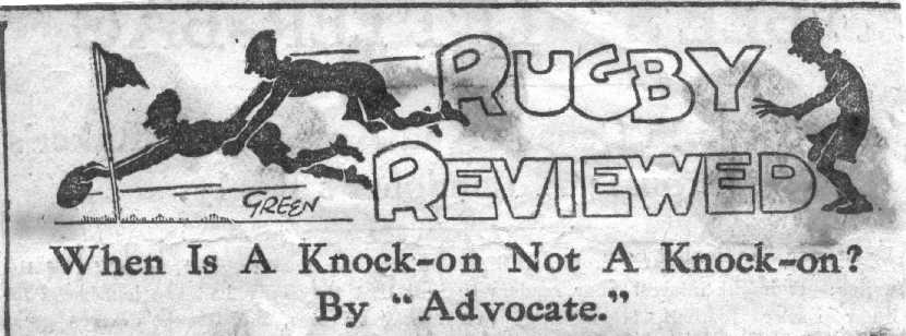 The club official who had raised the question contends that there is such wide difference in the opinion of referees as to what does or does not constitute a knock-on that it would be better if the controlling official was deprived of the onus of judgement in this matter by the definite ruling, either that the ball must be taken cleanly at the first attempt, or that the game should be allowed to proceed as long as the player who fumbles is able to gather the ball before it touches the ground. Each of the three alternatives has its own peculiar advantages. To keep to the literal interpretation of the definition is to impress upon the player the necessity for sure handling, and put a premium upon clean passing and gathering of the ball. To give further licence by allowing the ball to be gathered after being propelled well forward would reduce the number of checks and speed up the game to some extent. The intermediate course would be ideal were it not that it depends on simple sounding terms which are by no means easy to define. What is "a slight fumble ? When does a player lose control of the ball ?" Some will say that control is lost when the ball is no longer gripped by the hands, others will contend that the fact that a player ultimately gathers the ball is sufficient evidence of control even in the absence of contact with any part of the body.