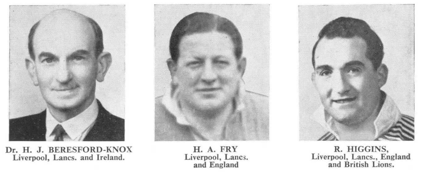In recent years many honours have come to the Liverpool Club. Martin Regan was capped twelve times for England and Reg. Higgins has gained the same number of English caps and has represented the British Isles in South Africa. Thanks to Reg’s pluck and ability he has already been capped four times after his serious accident in the British Touring Team’s first "Test Match" in South Africa, and we hope that he will establish a Club record by beating C. E.Allen’s 21 caps. The late J.K.Williams had an English trial and Ray Lee has had an Irish trial. Last April no less than seven of the first team played for Lancashire against the British Police.