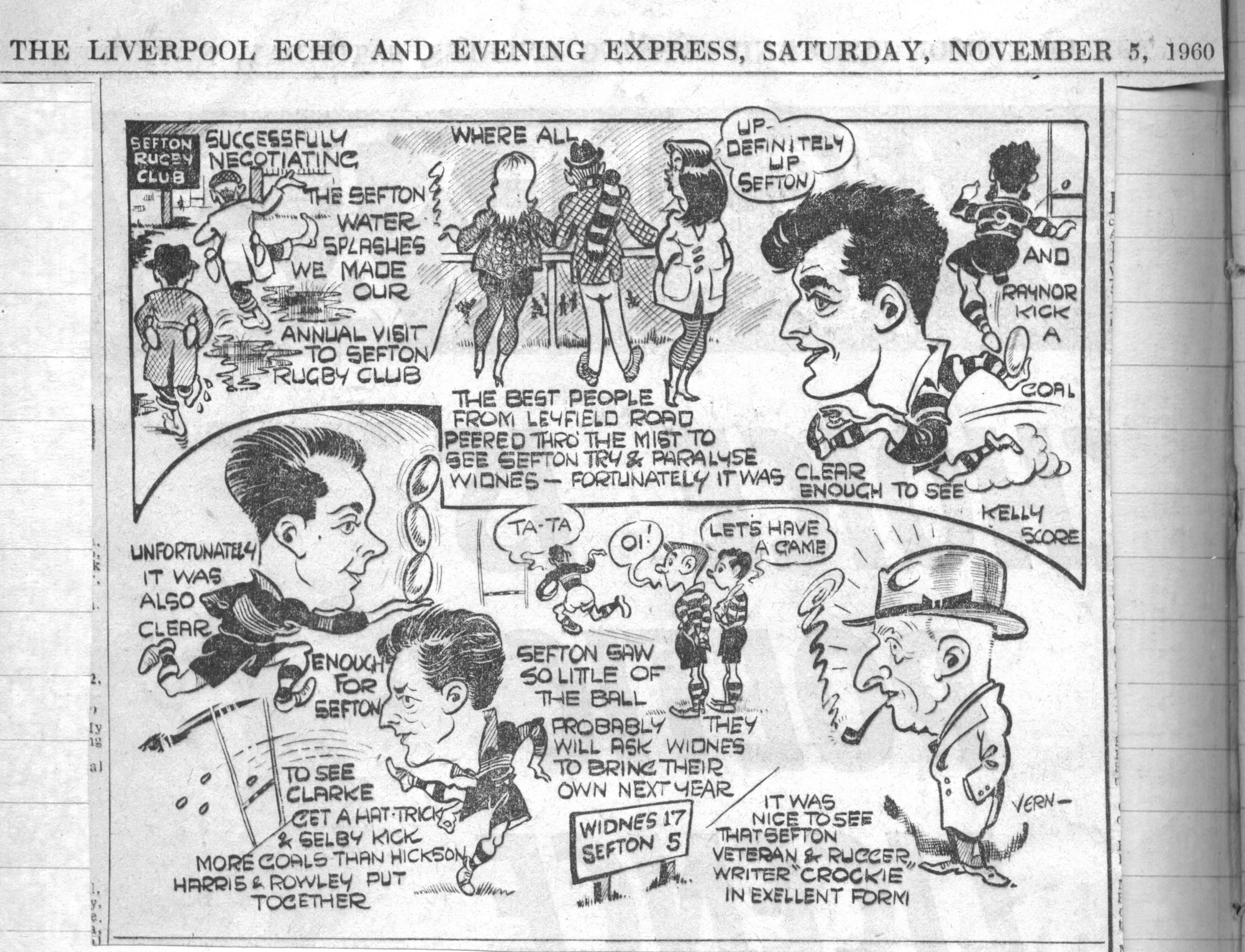 Vern Sharples was a brilliant sporting cartoonist for the Liverpool Echo and was always on the lookout for familiar faces in the crowd, this one in 1960 has picked out "Crockie" at a Sefton home game.