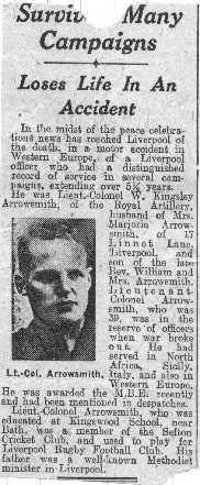He was Lieut.-Colonel W. Kingsley-Arrowsmith, of the Royal Artillery, husband of Mrs. Marjorie Arrowsmith, of 17 Linnet Lane, Liverpool, and son of the late Rev. William and Mrs. Arrowsmith. Lieutenant-Colonel Arrowsmith, who was 39, was in the reserve of officers when war broke out. He had served in North Africa, Sicily, Italy, and also in Western Europe. He was awarded the M.B.E. recently and had been mentioned in despatches.